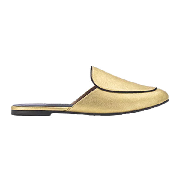 a relaxed take on our minimal and feminine LIZA loafer, this golden calf leather mule has a beautifully curved lid and black piping. perfectly paired with crop jeans, trousers, or slip dresses. - gold metallic uppers - black piping - cognac lambskin lining - black leather outsole - padded insole for extra comfort - heels measures approximately 0.25” - NewbarK is handmade in Los Angeles, California