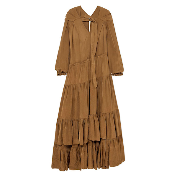 Phillip Lim is known for his modern tailoring and cool dresses that showcase a sense of individual style. This long-sleeve gathered dress is a perfect example. Cut in a crinkled fabric with ruffled tiers, an asymmetric hem, plunging V-neckline, and an adjustable tie closure, we’re dying to pair this frock with a pair of combat boots for an edgy boho vibe.