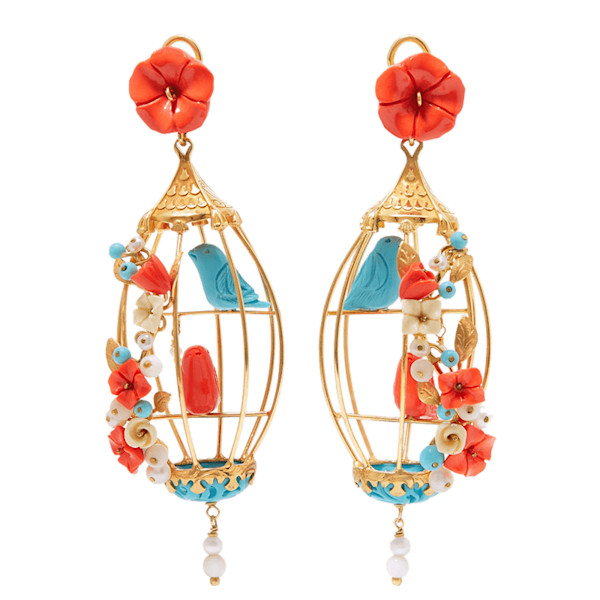 From Rare Origin founder Leslie Tcheyan’s “Aviary” collection, these fantastic earrings are meant to be “a graceful reminder of a loved one, friend, or a personal memory.” In summery hues of turquoise, coral, white agate, and pearls, flowers are juxtaposed with lovebirds in a cage. Pair with a simple, ethereal white dress.