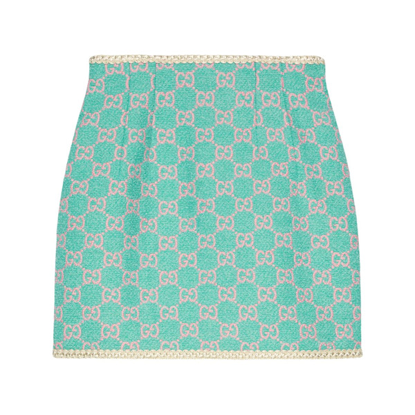 Gucci's micro mini with macro logo is a cheeky way to celebrate the season's logo trend. Pair this tweed skirt with white contrast ribbon detail in two sweet colors with denim and jeweled shoes. Mid rise, darted front, a-line silhouette and back zip closure.In cotton/nylon/acrylic/viscose.