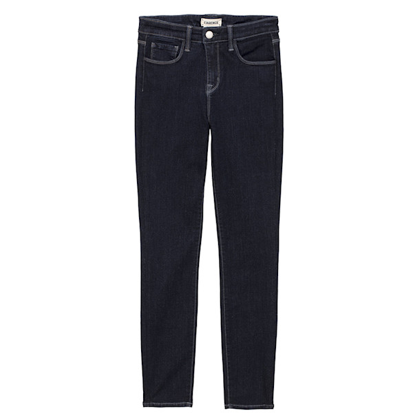 L'Agence's signature high-rise skinny jean crafted from premium, luxurious stretch denim in saturated black with subtle contrast stitching. Tapered leg hugs from hip to ankle, while the contoured waistband defines and slims the natural waist. High-recovery fabric holds its shape, smoothing the silhouette without sacrificing comfort.