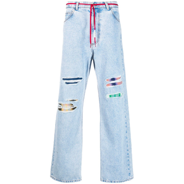 Marni's ripped light-wash jeans featuring light blue, cotton, mohair blend, washed denim, light wash, ripped detailing, knitted construction, logo patch to the rear, wide leg, belt loops, front button and zip fastening, drawstring fastening waist and classic five pockets. Made in Italy.