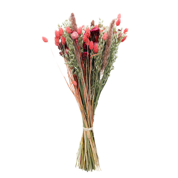 This colorful pink and purple dried flower bouquet was grown and arranged on a small, sustainable farm in the flower capital of the world, the Netherlands. This artful arrangement perfectly balances warm and cool tones with natural and water-based dyed florals including phalaris, oats, and everlastings.