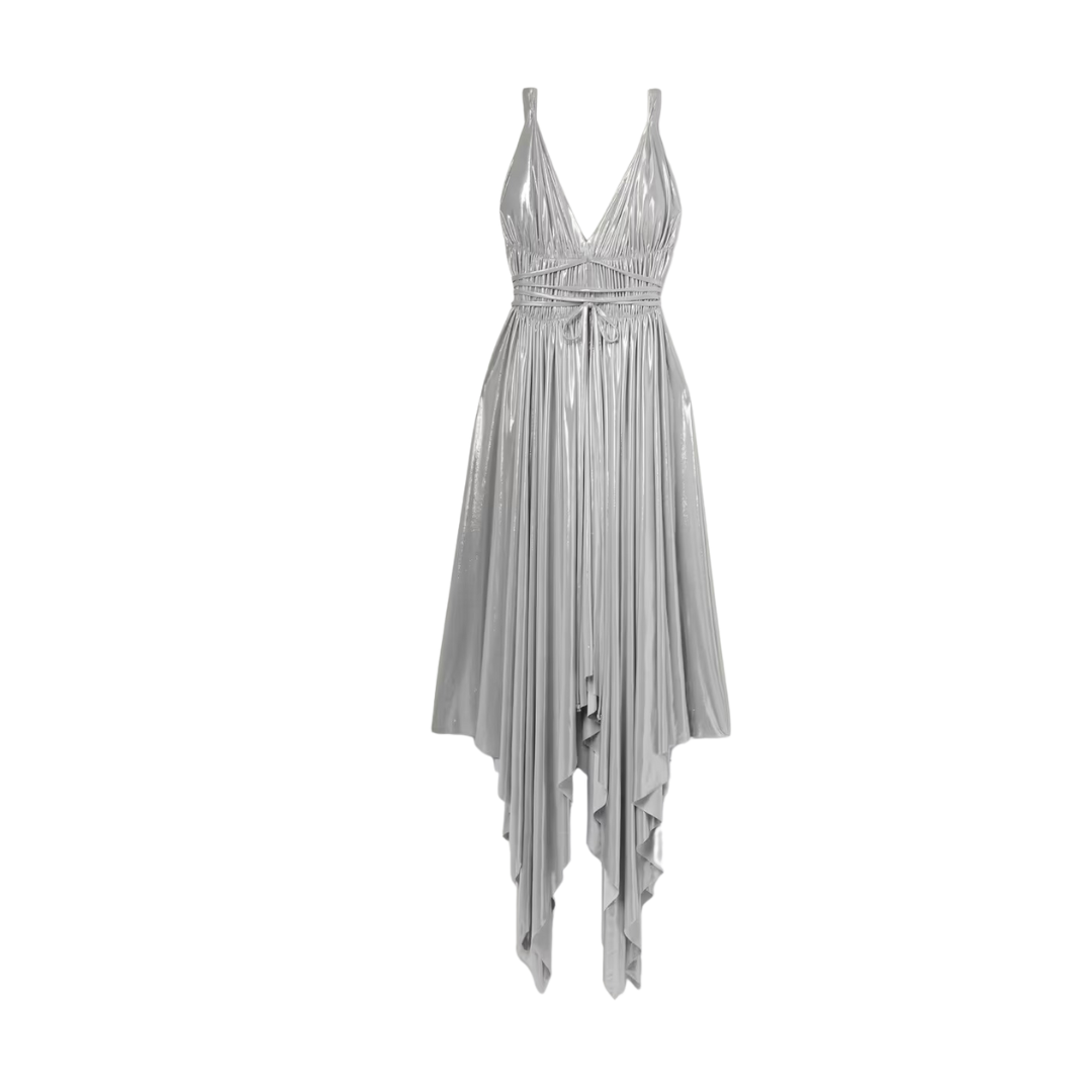Norma Kamali's Goddess dress recalls styles worn in Ancient Greece. In silver stretch-lamé, gathered and draped, it falls to a handkerchief hem. With ties to wrap and cinch the waist.
