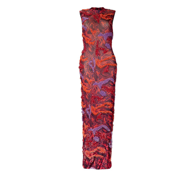This pink, red, and purple abstract-print sleeveless maxi dress with hand beaded and embellished layers comes in an impressive range of sizes, and can be ordered with or without a lining. 100% hand printed, hand beaded, and made to order, so there may be a slight variation from one item to the next.