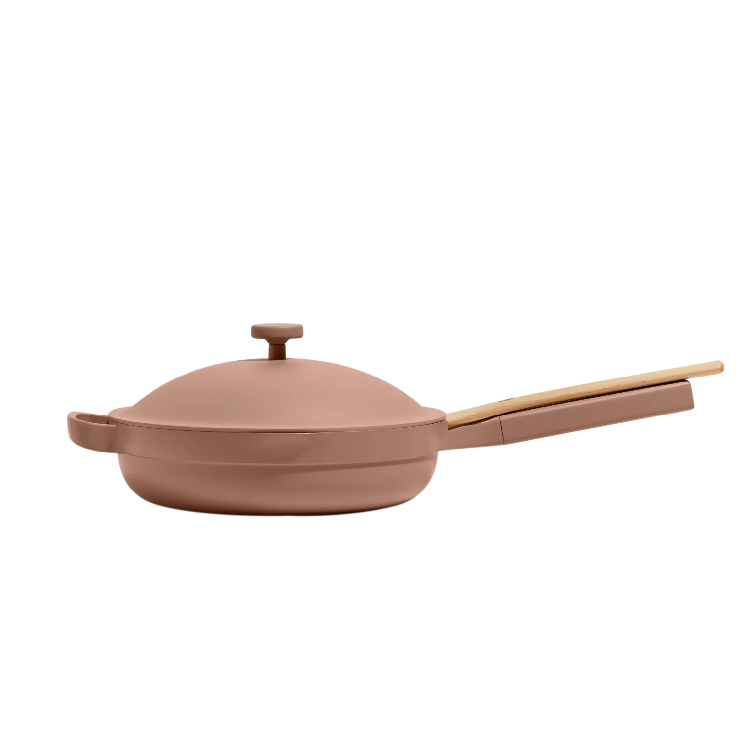Deep enough to roast a chicken, shallow enough to flip an egg, the Always Pan 2.0 is the gold standard for versatility, doing the job of ten pieces of traditional cookware. A 10.5 inch pan that braises, sears, steams, strains, sautes, fries, boils, bakes, serves, stores. Featuring Thermakind...50 percent longer lasting ceramic nonstick coating made without toxic materials. Oven safe up to 450 degrees.