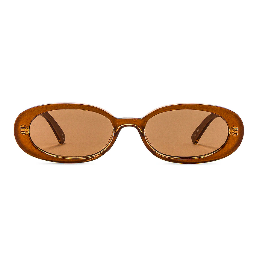 This petite, slimline oval silhouette features a modern flat profile and signature Le Specs gold metal hardware.