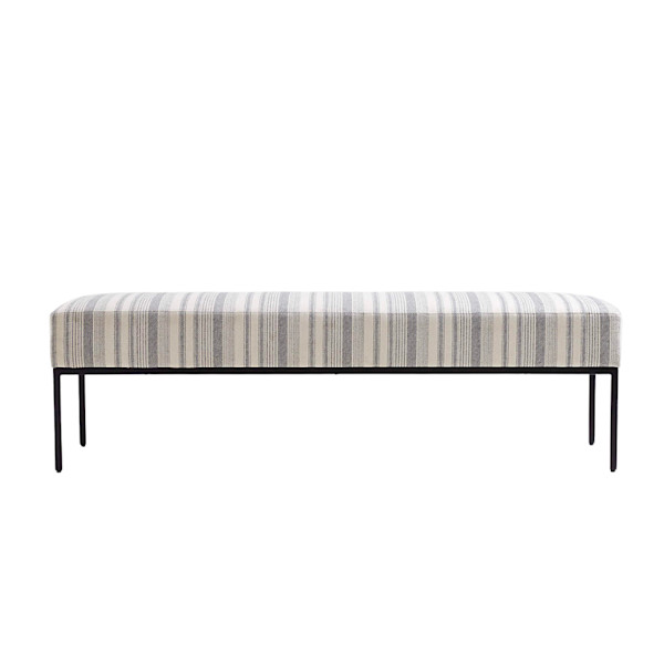 The bench's generously sized box cushion sits on black-finished solid mango wood legs, a linear design that's perfectly complemented by the modern striped upholstery in decor-friendly grey and natural. Made of cotton and jute, the fabric looks crisp and offers a great textured hand.