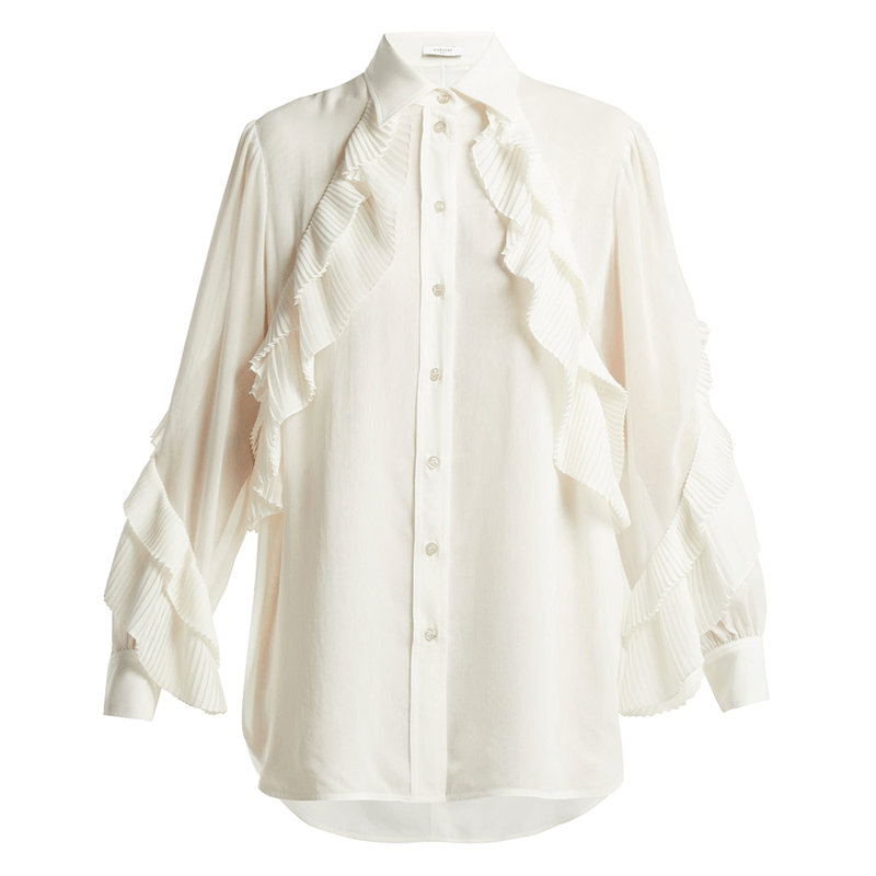 We’re swooning over this blouse from French luxury house Givenchy. Made of white silk-blend chiffon and trimmed with accordion-pleated tiers, this is the perfect opportunity to update your conventional white blouse staple to something positively statement-worthy. Pair with high-waisted denim for a trend-right look.