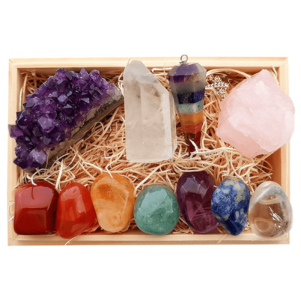 Filled with the highest-quality crystals, this gift box comes complete with 7 chakra tumble stones: clear quartz, amethyst, sodalite, green aventurine, citrine, carnelian, and red jasper. Also included are 7 chakra pendulum crystals. Perfect for meditation, reiki, or for boho-chic home décor accents.