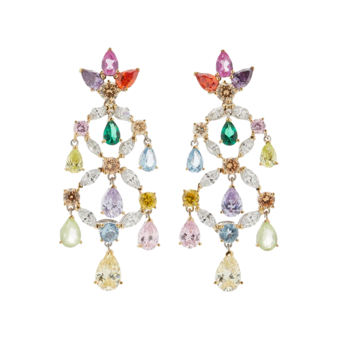 A stunning pair of cocktail earrings in 18k gold and white gold vermeil with 18k gold earring posts, hand set with a rainbow array of laboratory-grown synthesised and simulated gemstones including pear, marquise and round brilliant-cut canary and white diamonds, pink and orange sapphires, blue topaz, green emeralds and violet amethysts.
