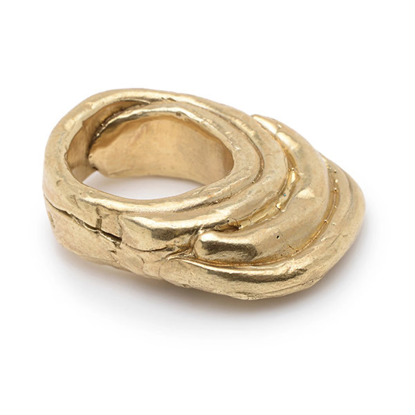 A play on the stack ring, rows of brass on brass, clime high above the top of your finger. The ring itself is wrapped into the first layer. The hand crafted brass is brightly polished and weighs 38 grams. This statement ring is funky and artsy, as it's hefty and substantial, and reminiscent of Rebecca Nadler sculptures.
