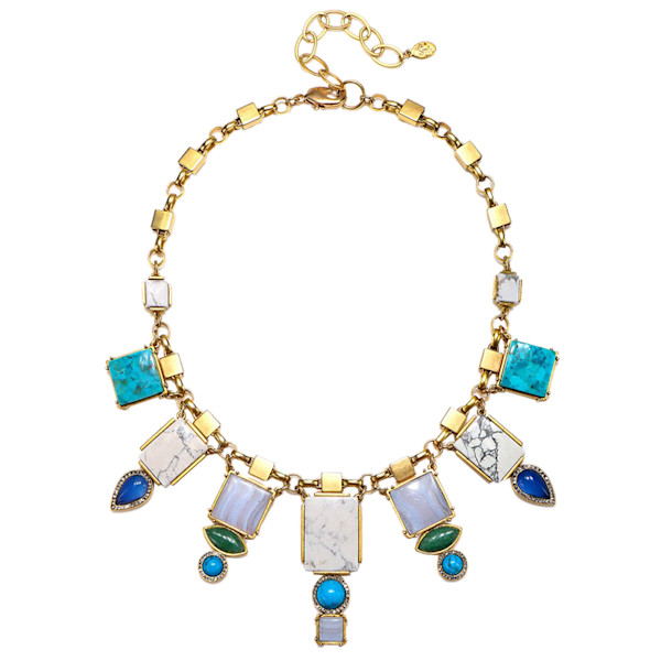 Inspired by the color of the coral reefs in the Florida Keys, this necklace is a mix of howlite, turquoise, jade, mother of pearl, African turquoise, blue lace agate, and crystal details. Made from 22k gold-plated brass, we love the idea of adding this decorative piece to a simple weekend look.