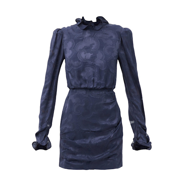 With a mini hemline Saloni's Rina-B dress is sure to make a statement this season. Crafted from a delicate jacquard with a subtle sheen, this short dress features a high neckline trimmed with a ruffle, exaggerated shoulders and long sleeves that finish in a structured frill that falls delicately over the hand.