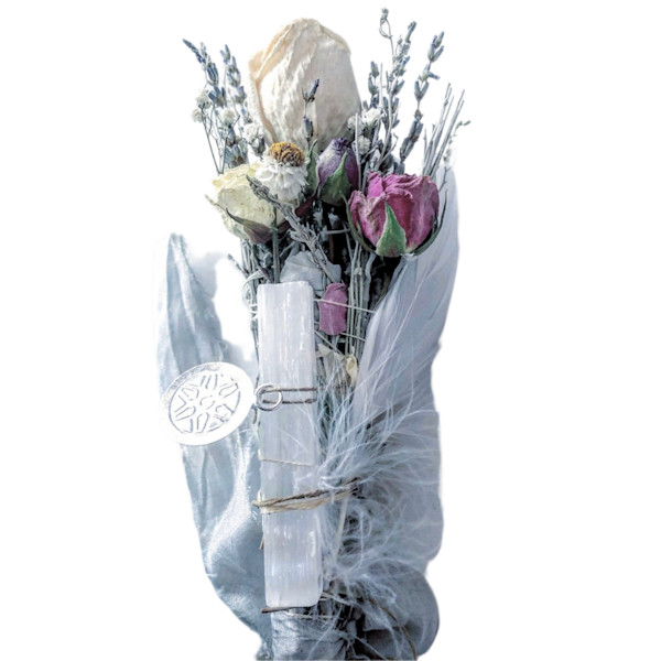 A beautiful floral smudge wand highlighting gorgeous creamy roses, California white sage, desert sage, wildflowers and local lavender.Beautifully designed with much care and detail. Includes a gorgeous silky selenite wand. Bundled together with sari ribbons, a white feather and a vintage charm.