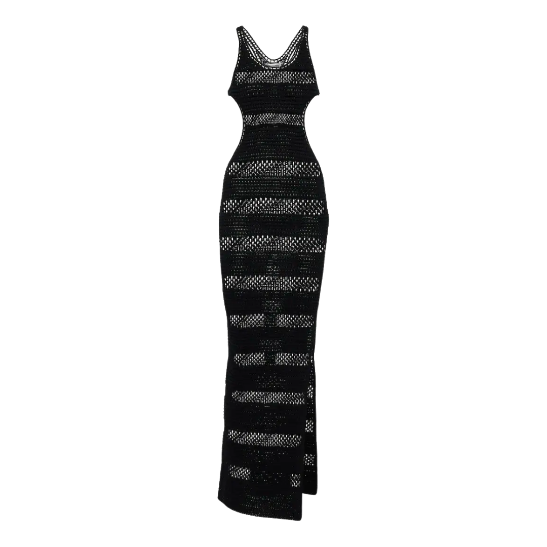 Made from crochet cotton, Saint Laurent's body con maxi dress with a scoop neckline and side cutouts, with high side slit.