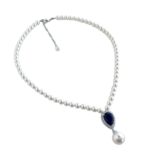 Classic blue sapphire cubic zirconia teardrop and pearls bridal necklace in rhodium plated brass setting. This gorgeous necklace features a large teardrop pendant with pear cut sapphire cubic zirconia center surrounded by tiny round zirconia crystals with a dangling 12mm swarovski pearl drop. This pendant is strung in a row of Swarovski pearls.