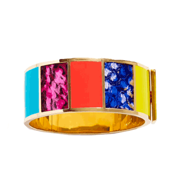 Inspired by textures, colors, and spirit of Frida Kahlo's Mexico- the Technicolor Bangle is a mixed media dream. Painted watersnake is inlaid with hand-painted enamel in bright colors. Our clever hinged bangle is sleek and fits in an oval shape for comfort. There is a safety latch for added security in case of serious dance parties. Fits small-medium wrists. brass metal, 12k Gold finish. After designing for large fashion brands for 10 years, Sarah launched Sarah Magid Jewelry in 2013. Inspired by feminine geometry, Modern Art, and bold color, the collection is designed with the 'Modern Woman' in mind, and her need for jewelry crafted with style and accessible price points. Sarah designs each piece with this in mind, from the signature ear clutches to the stone cuts in semi-precious material. Many pieces stack, layer, or have details such as adjustable lengths so that it can work with different individual styles. All the pieces are crafted in brass metal, Swarovski stone, and hand-cut semi-precious stones.