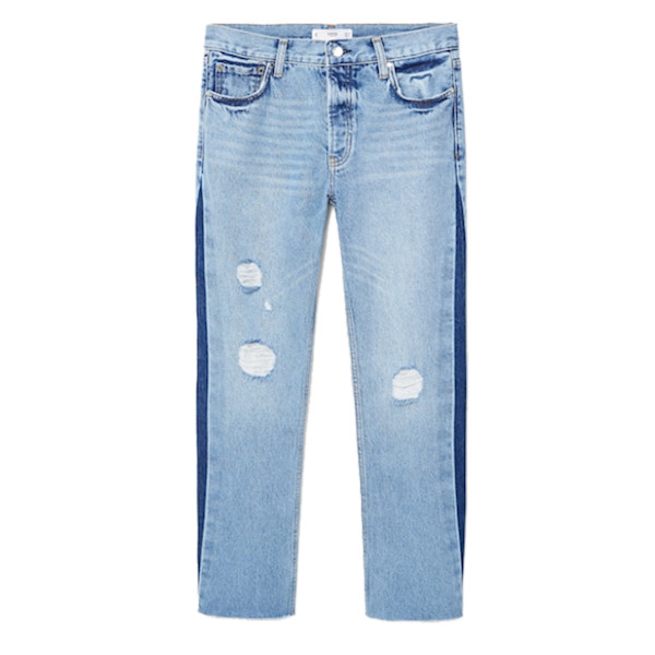 From Mango’s organic collection, these straight-fit cropped jeans with side contrast panels have a mid-rise for a casual, flattering fit. In a distressed wash, you can pair with a striped tee for the perfect weekend look or achieve a polished effect by pairing with a blazer and heels.