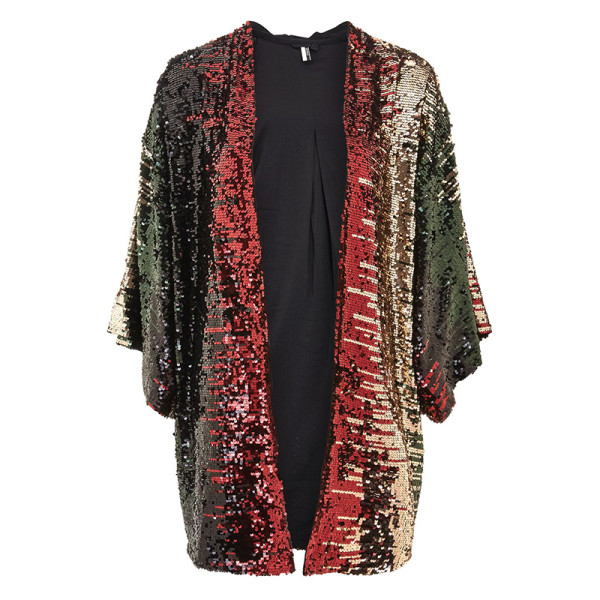A simple way to throw together a glitzy look for the evening, this multicoloured sequin embellished throw on kimono with three quarter length arms adds instant class to any look. We're wearing over a basic slip dress and heels for a look that's effortlessly elegant. 100% Polyester. Hand wash only.