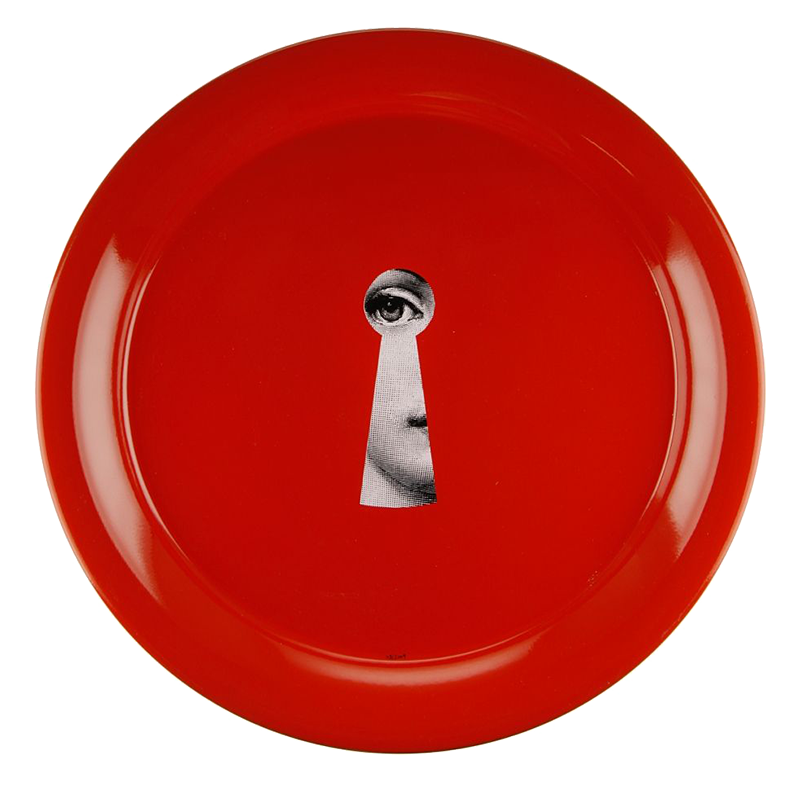 Handcrafted of red, black, and white metal, this cheeky round tray features a lithographic image of Fornasetti’s muse Lina Cavalleri peeking out from behind a keyhole. It’s the perfect conversation piece to serve appetizers with a sprinkling of whimsy.