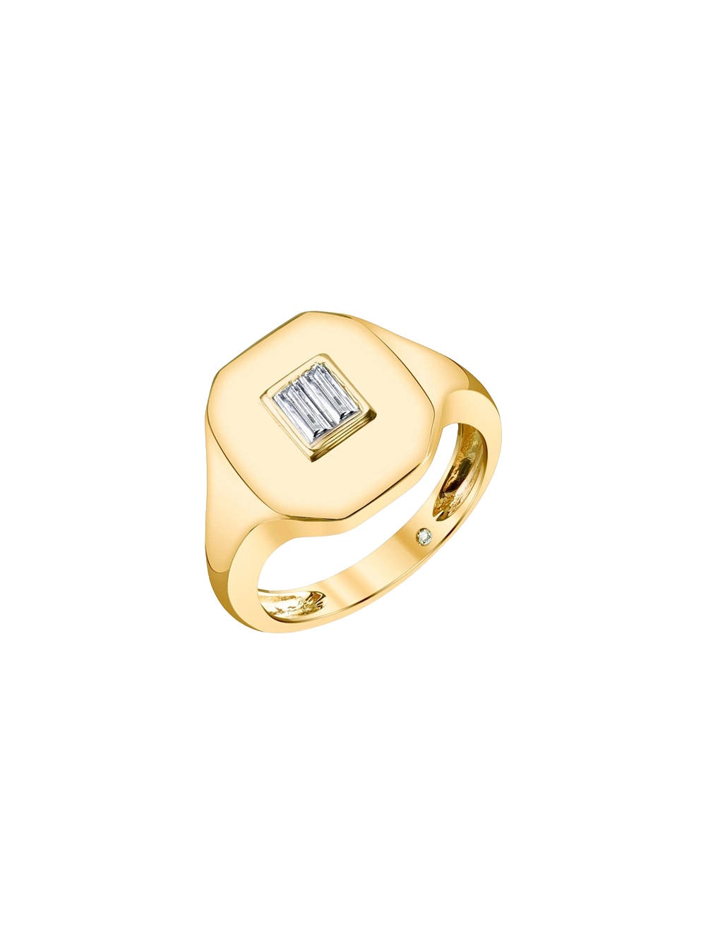 This signet-style pinky ring in 18K yellow gold features a center baguette diamond and 0.15cts of white diamonds. Ring height: 12mm.