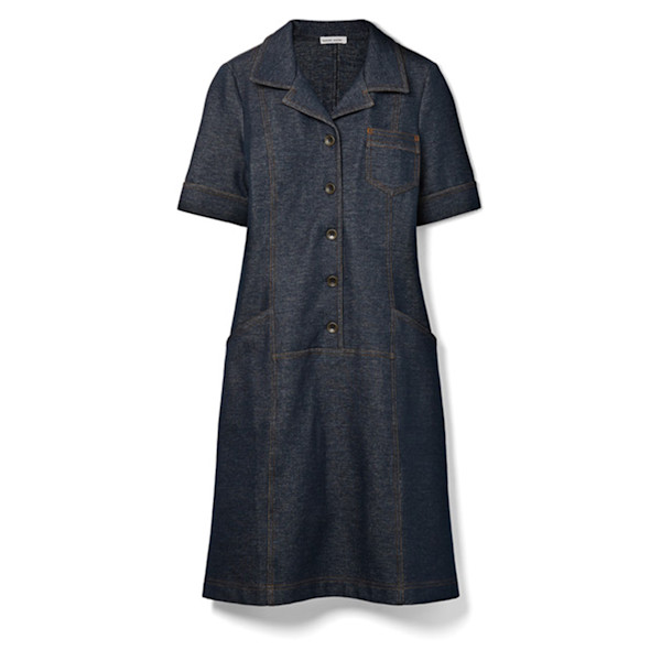 Tomas Maier takes a youthful approach for his Resort '18 collection. The first look in the presentation, this shirt dress is cut from a double-stitched stretch-cotton fabric that's meant to resemble dark-wash denim. It has folded cuffs and large side pockets that give it a utilitarian feel.