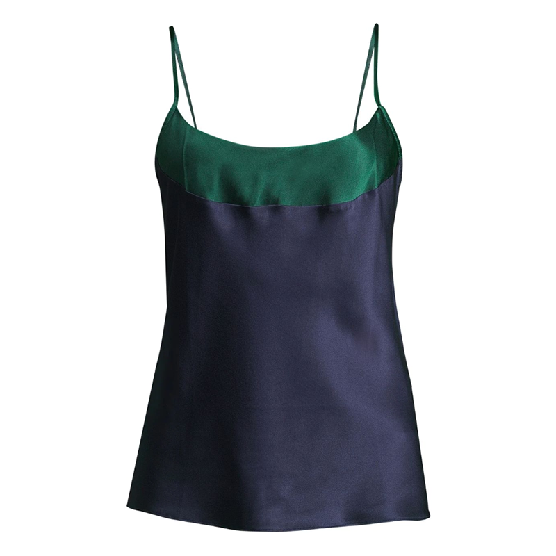 A modern silk camisole ideal for the everyday. Designed from a lustrous silk satin in a classic navy blue, this cami features a contrasting emerald green band, a scoop neckline that falls into a v at the back and fine adjustable spaghetti straps.