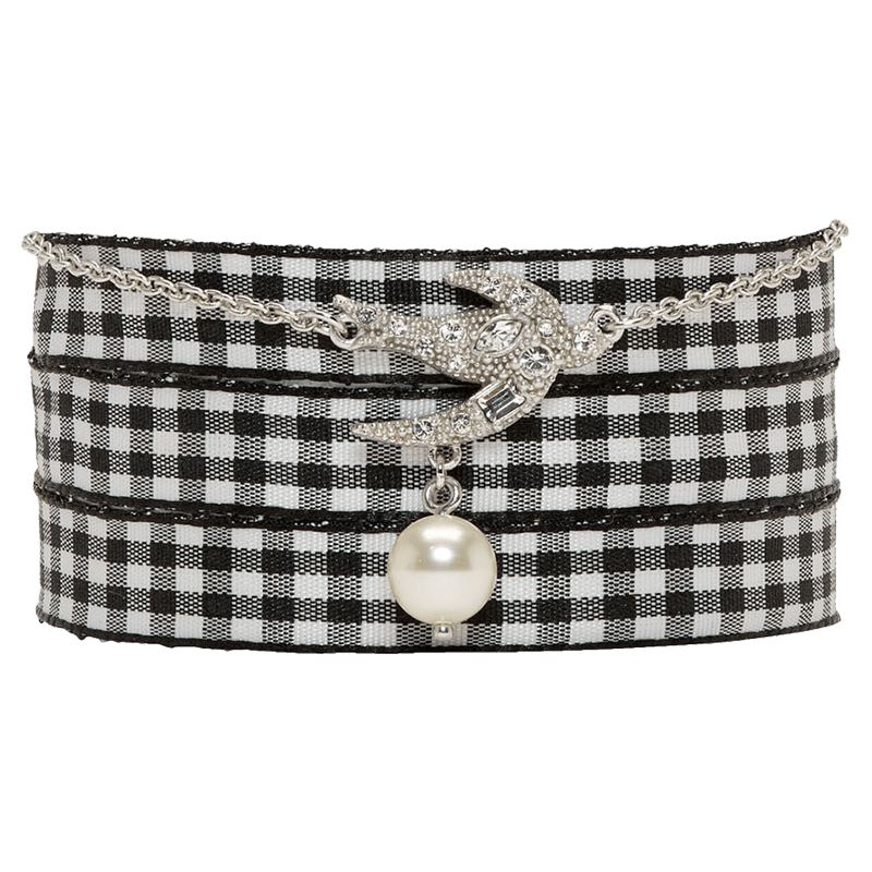 This grosgrain ribbon bracelet with Swarovski crystal detailing and a pearl drop pendant is equal parts pretty and punk. In a gingham pattern, wear it as your summer statement piece with jeans and a tee or an LBD.