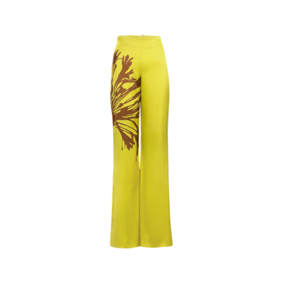 Crafted of light stretch silk, Silvia Tcherassi's Andie pants highlight the boot-cut silhouette with a placed dandelion graphic.These pants feature a clean waist, and a concealed back zip closure. They are 94% silk and 6% elastane. The yellow dandelion color is a bright chartreuse.