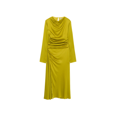 Dreamt up in lustrous satin, the Odessa dress embraces fluid dimension with its draped neckline and strategically gathered bodice. Bias-cut seams and a slit at the hem enhance the skirt's flowing shape. The pear color provides a vibrant pop of color for any look.