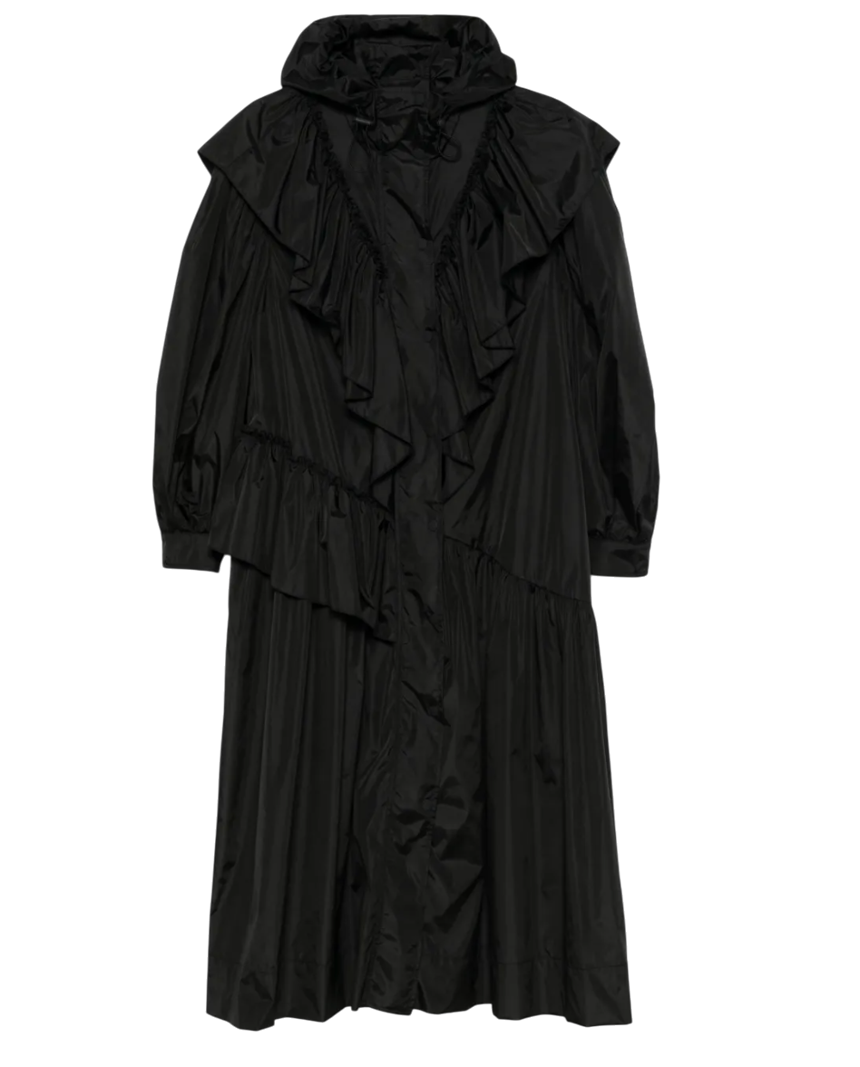This black Simone Rocha coat features front press-stud and zip fastening, drawstring hood, two side inset pockets, press-stud fastening cuffs and ruffles that make a statement.
