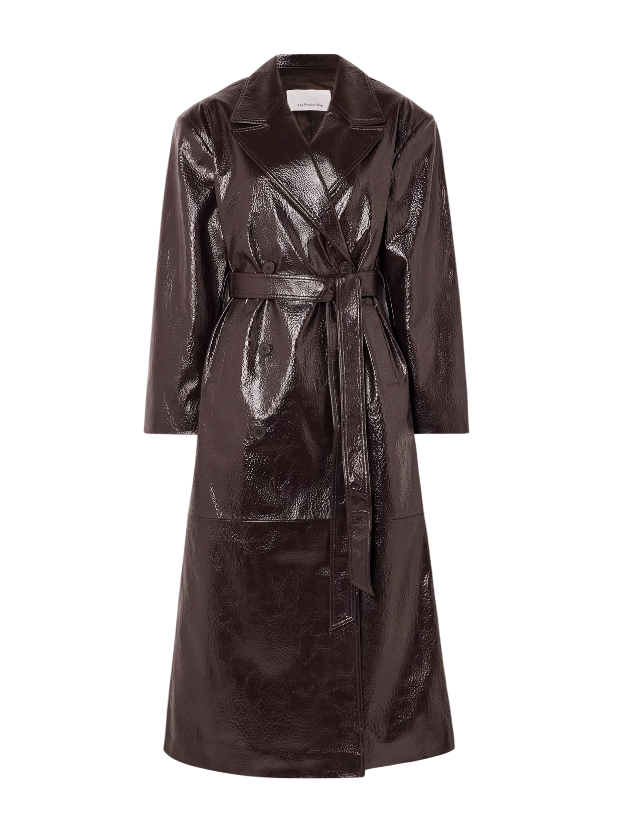 The Frankie Shop's 'Tina' coat is a longline, double-breasted design in crackled faux leather, with notch lapels, sloping shoulders, and a self-tie belt. Perfect for dresses or tailoring.