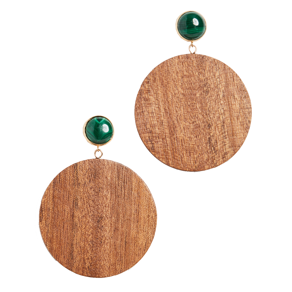 The Saga Earrings add beautiful malachite, Shedua wood and a gold-plated brass backing. Handmade In Venice, CA