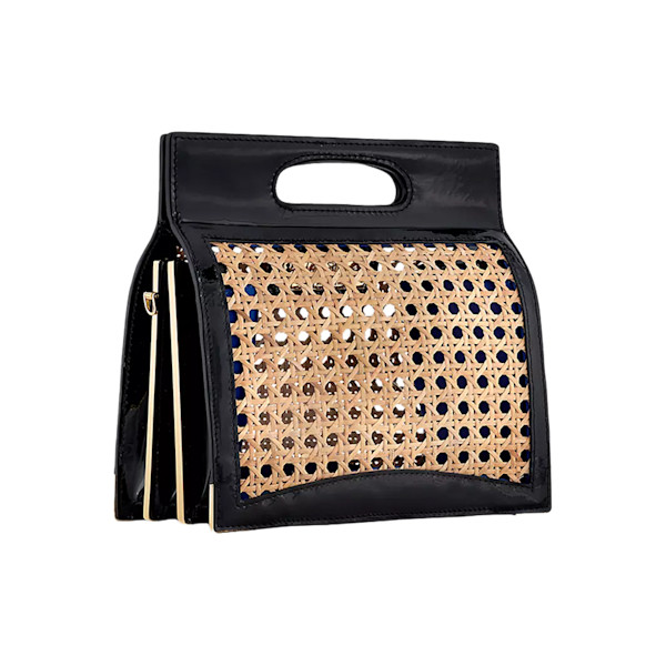 Tyler Ellis's Stella handbag is a structured handbag with a magnetic closure and an optional cross-body chain with a patent leather wrapped accent and wicker detailing. It fits the a iPhone, has custom exterior metal detailing, interior pockets, an extra-long key fob and features the brand's signature bold Thayer Blue lining.