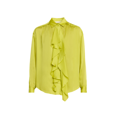 The Ulla Johnson "Gesture" luxurious silk-chiffon blouse is adorned with cascading ruffles. This blouse features a point collar, dropped shoulders, long sleeves with button cuffs. It is an oversized fit. The chartreuse color adds a cheerful burst of color to any outfit.
