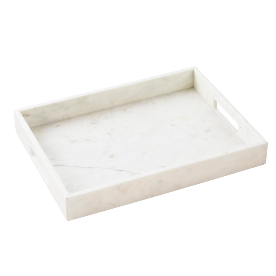 This beautiful tray is handcrafted of solid white marble and smoothed by hand to a lustrous finish. Freezer safe.