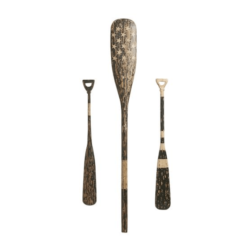 Add nautical flair to any space with these hand-carved wooden oars. Set of three.