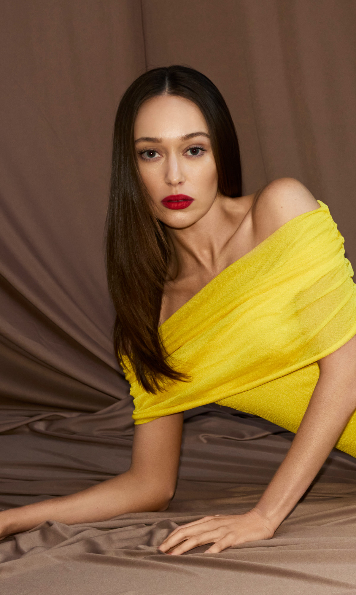 Christian Dior dress; Bulgari watch.CND nail color in Rubble and Peach.