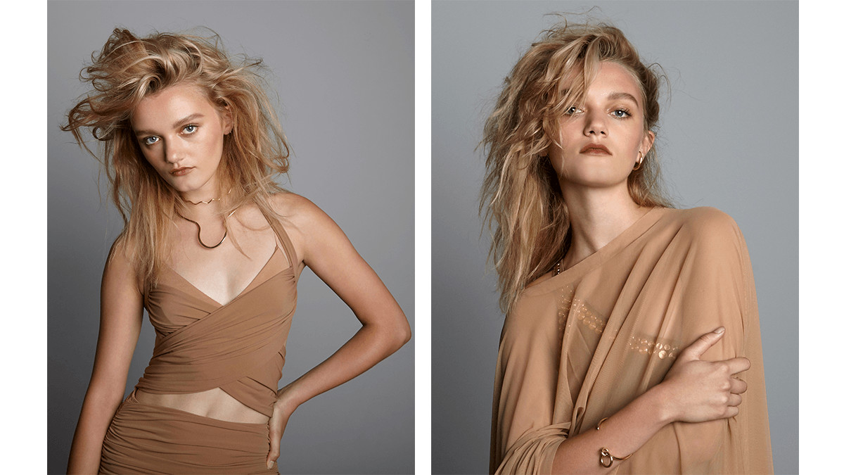 LEFT: Norma Kamali Swimsuit; Baserange Bra; Ana Khouri Necklace; Lady Grey Choker. RIGHT: Norma Kamali Swimsuit and Poncho; Ana Khouri Earring; Lady Grey Bracelet.
