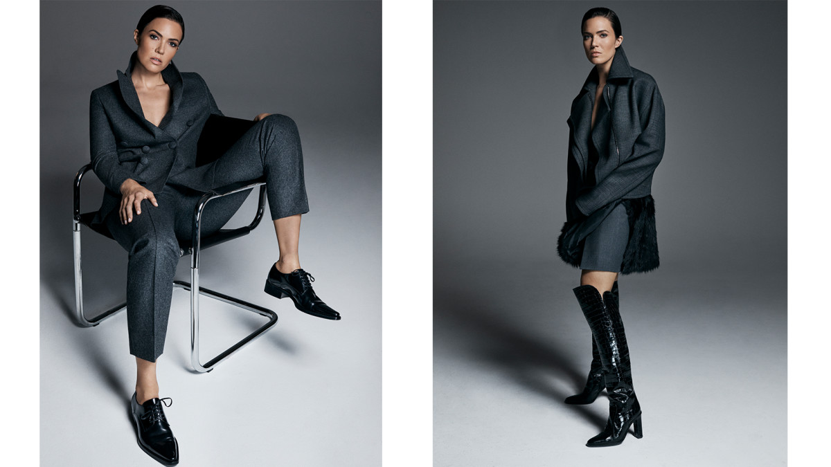 LEFT: Officine Générale Jacket and Pants; Dolce & Gabbana Shoes. RIGHT: Hugo Boss Coat; Max Mara Boots.