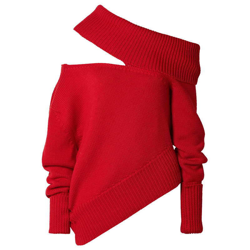Innovative construction meets cozy winter staple to get you all the compliments. With a cool cutout/slashed effect at the shoulder, this bold red sweater crafted from fine Italian wool stands out from the rest as the statement piece of the season.