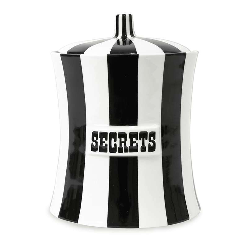 American potter and designer Jonathan Adler is known for his whimsical and playfully irreverent designs. Take this black-and-white striped ceramic canister emblazoned with the word "Secrets." We can think of so many things we'd love to put in here.