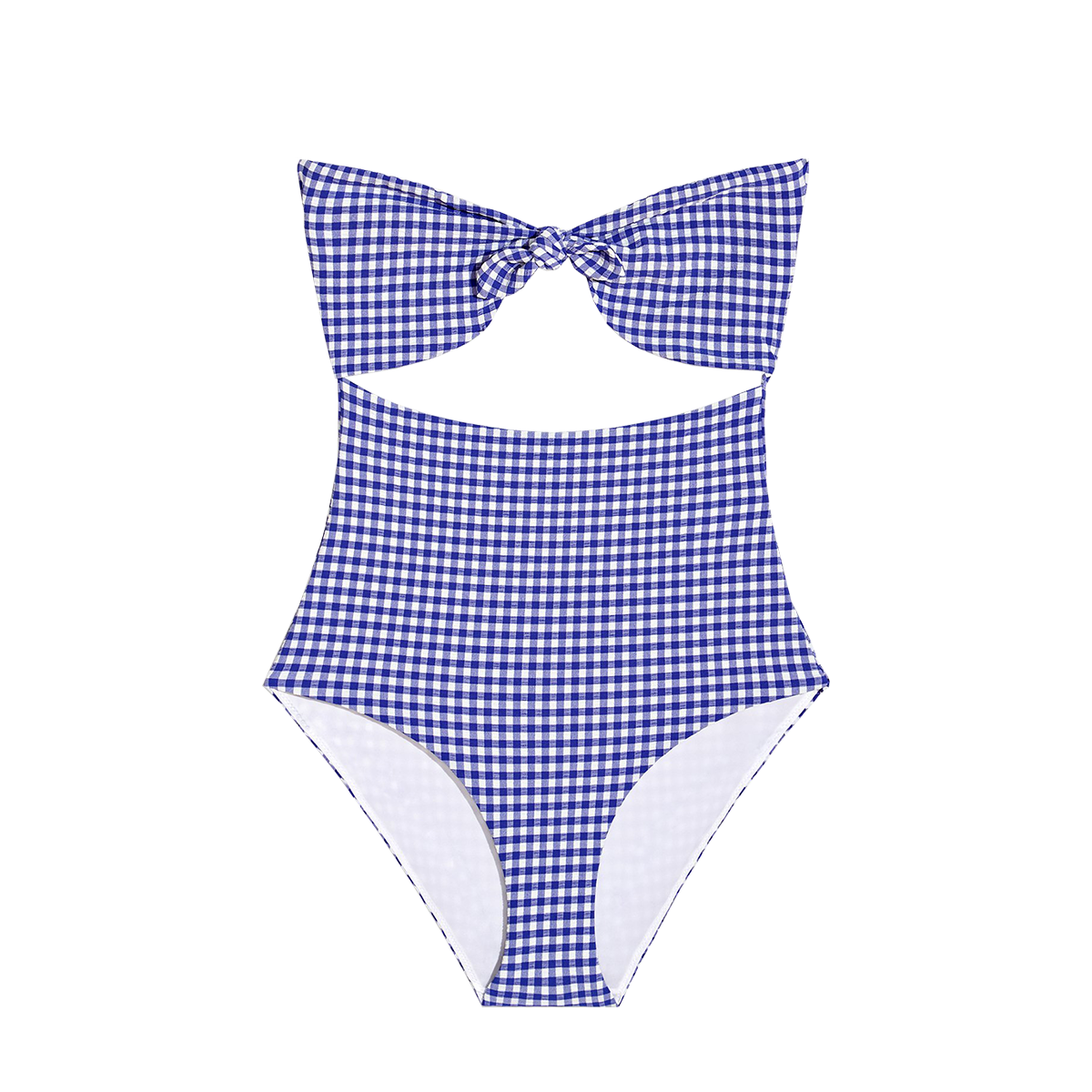 This suit gets the glamorous upgrade it begs for with a printed mini and structured straw carryall.