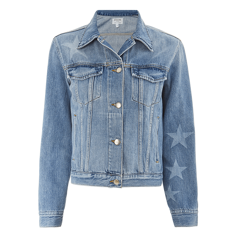 We’re 100% in love with this 100% cotton faded denim jacket with star detailing. With a standard fold-over collar and flap front chest pockets, you can pair this piece with almost anything, including jeans for a very of-the-moment denim-on-denim look.