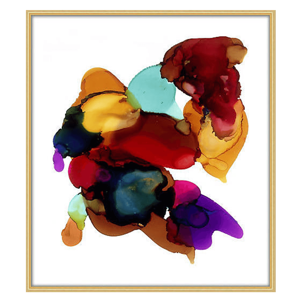 When people talk about a “conversation piece,” this is what they mean. Saturated jewel tones in an abstract print, this gold-framed painting comes from iconic interior designer Lillian August.