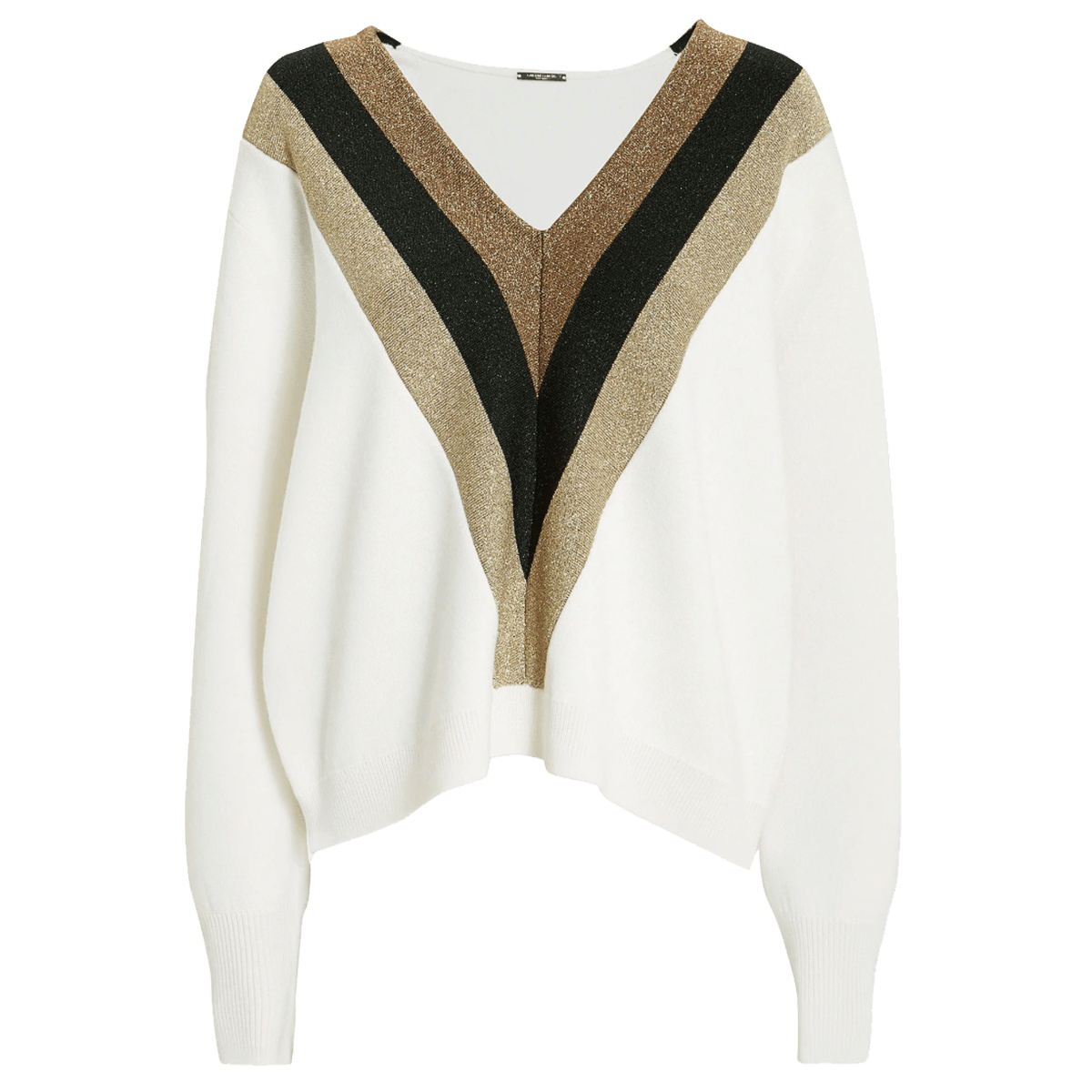 Shine bright in this V-neck sweater in shimmery color-blocking. For an instant style boost, it’s the perfect piece to wear all season long. Made of wool, it’s got the coziness of your go-to sweaters, but with added metallic flair.