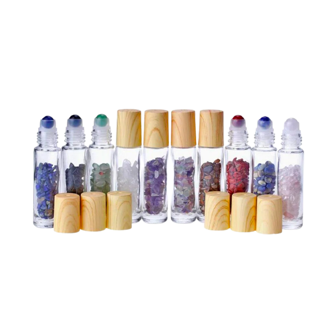 Gemstone Rollerball Bottles Set I've been in love with rocks + gemstones since I was a little girl. Recently I started mixing my own fragrances in gemstone-topped bottles. 10 bottles each contain a gemstone rollerball + gemstone chips. For the DIY beauty + wellness lover in your life.