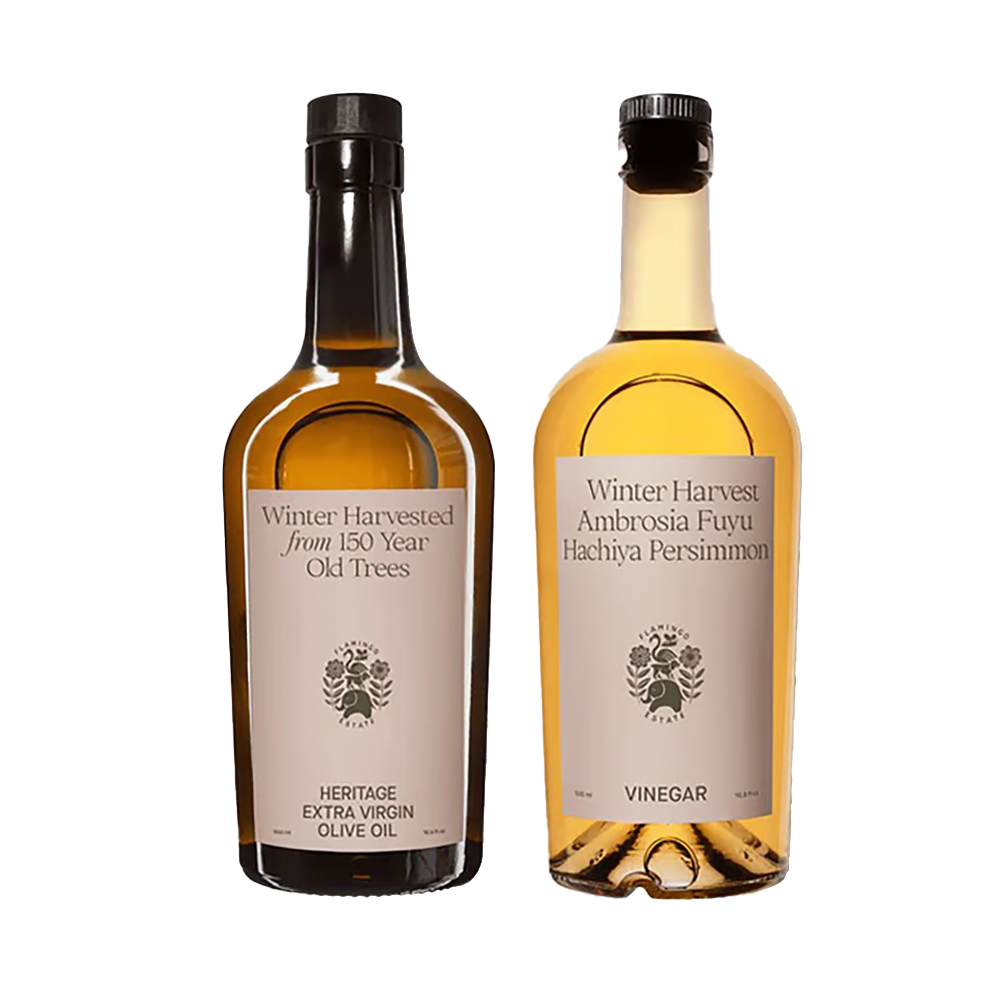 Flamingo Estate Olive Oil + Fuyu Persimmon Vinegar Drizzle Flamingo Estate's high quality olive oil and vinegar liberally. Flamingo Estate proudly and exclusively supports farms using sustainable, organic methods grounded in the principles of regenerative farming.