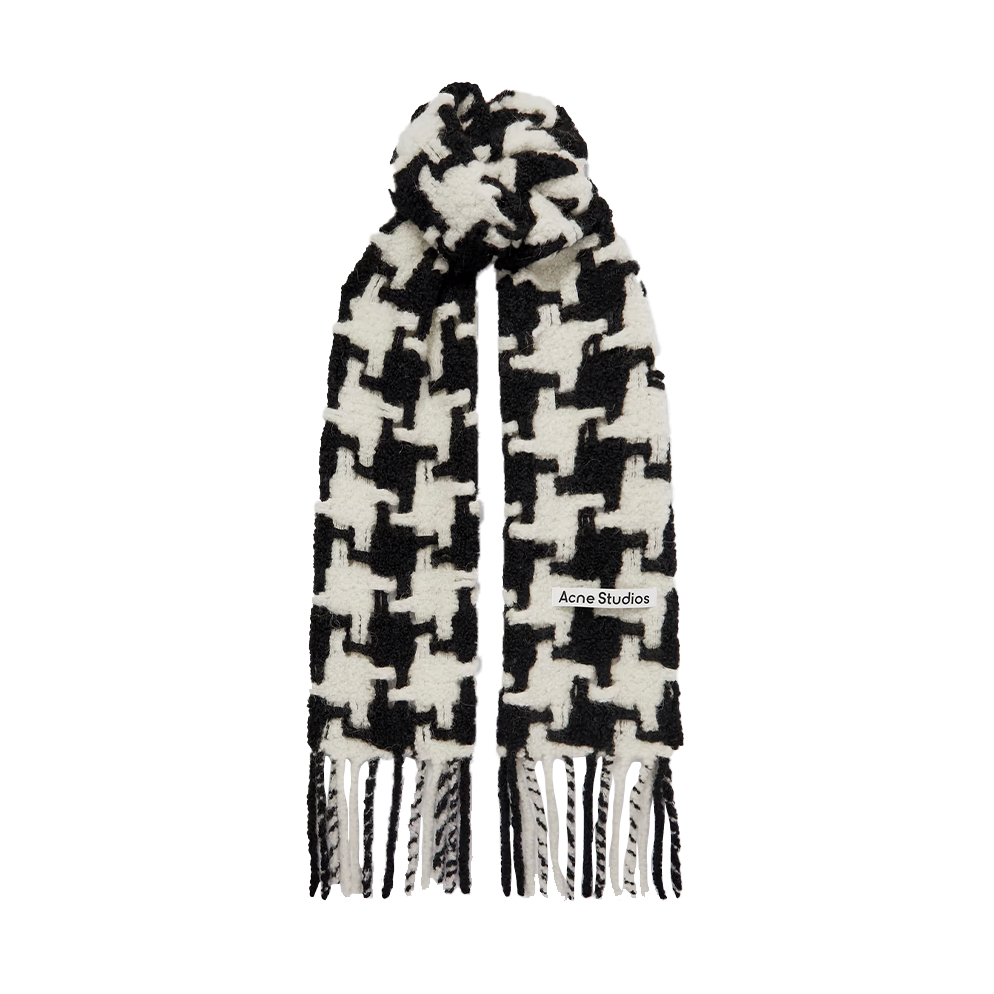 Acne Studios Fringed Houndstooth Alpaca Blend Scarf Acne Studios scarves are a favorite for their cozy feel and oversized, statement look. In bold white and black heavy houndstooth, this scarf is made of an alpaca and nylon blend with fringed ends.